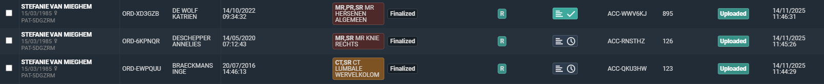 If multiple studies linked to different orders are uploaded for the same patient in one session, they are not grouped but listed as different orders with one patient ID. One patient, different studies linked to the same order If multiple studies linked to the same order are uploaded for the same patient in one session, they are grouped together and displayed as a single order with one patient ID. |